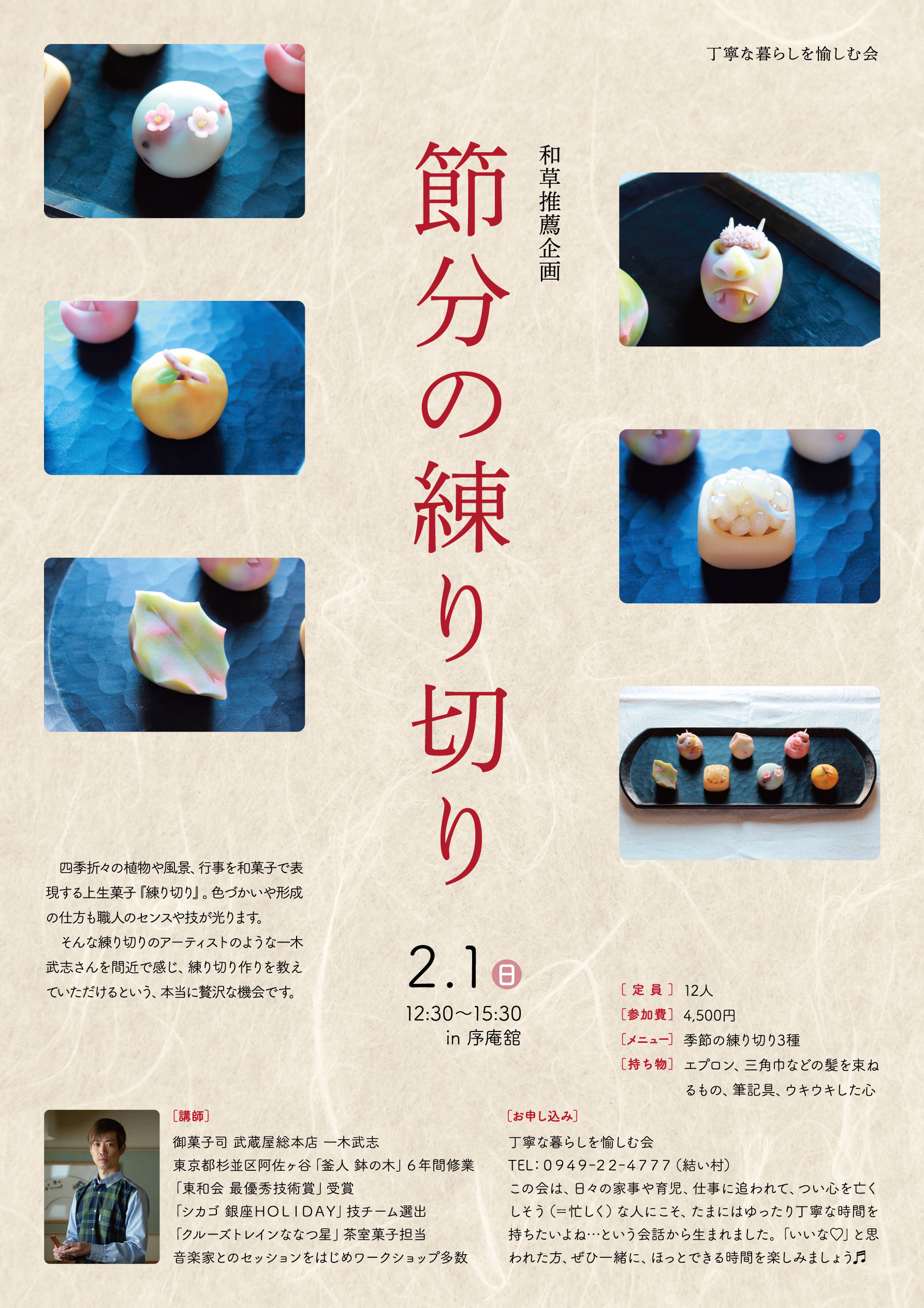 そんな練り切りのアーティストのような一木武志さんを間近で感じ、練り切り作りを教えていただけるという、本当に贅沢な機会です。 - イベント詳細