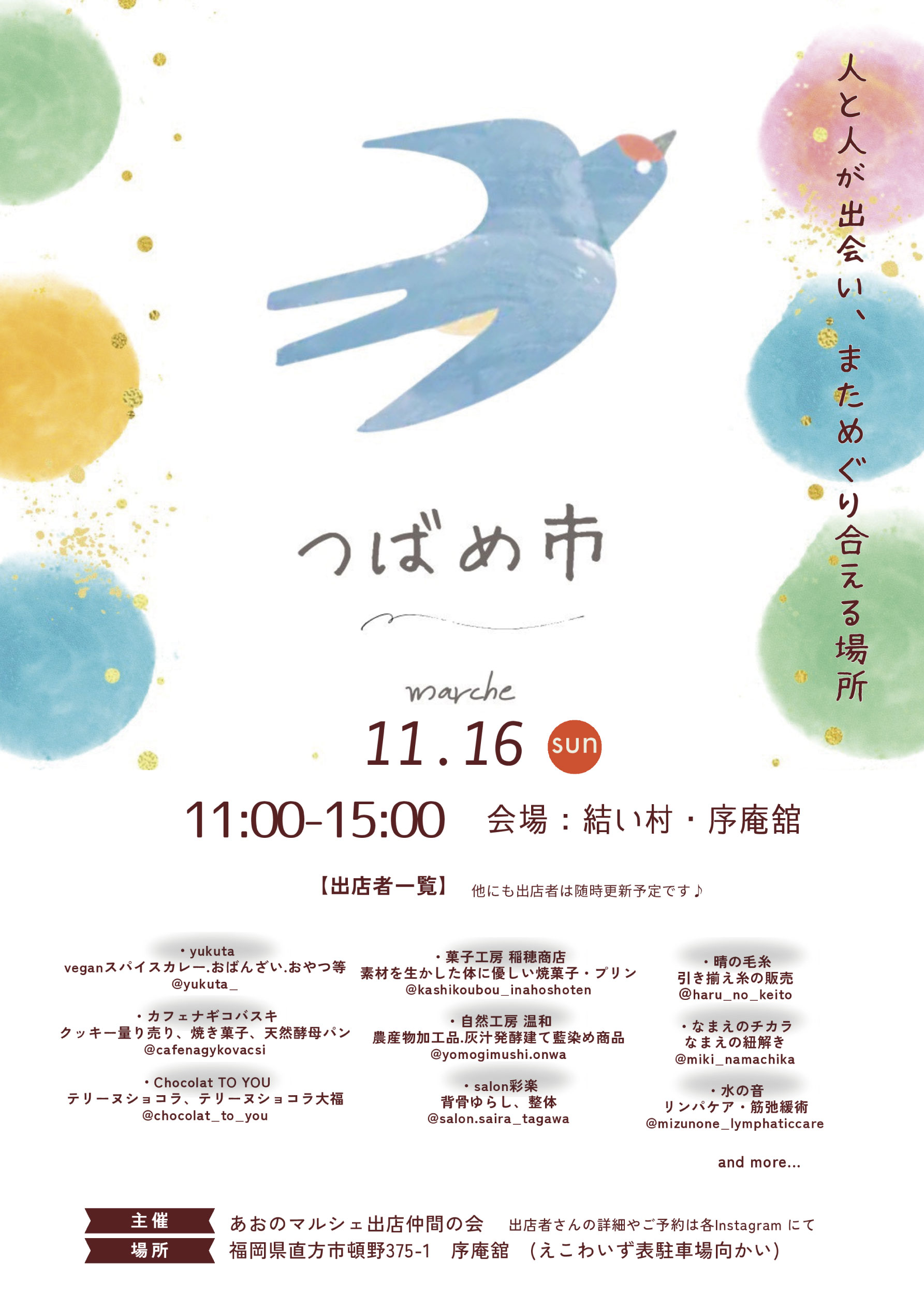 7月をもって一区切り…とお伝えしていた あおのマルシェ。けれど、毎回生まれるご縁と笑顔、足を運んでくださる皆さまの温かなまなざし。そして何より、出店者たち自身がこの場が愛おしすぎて終わるに終われず・・・。今度は出店者が主催となってマルシェを繋ぐことに決めました。つばめが季節になると同じ場所へ帰ってくるように、人と人が出会い、まためぐり会える場所になりますように。名前は『つばめ市』。形は変わっても、想いはそのままに。